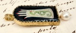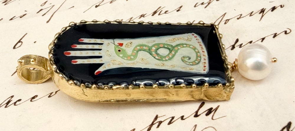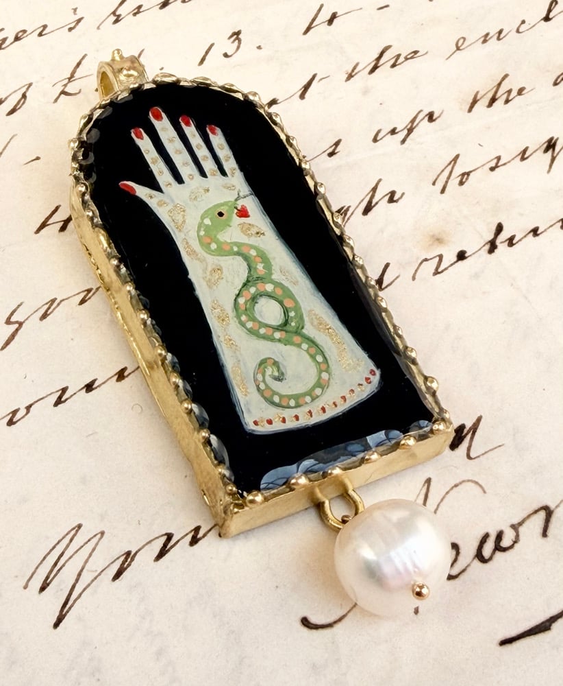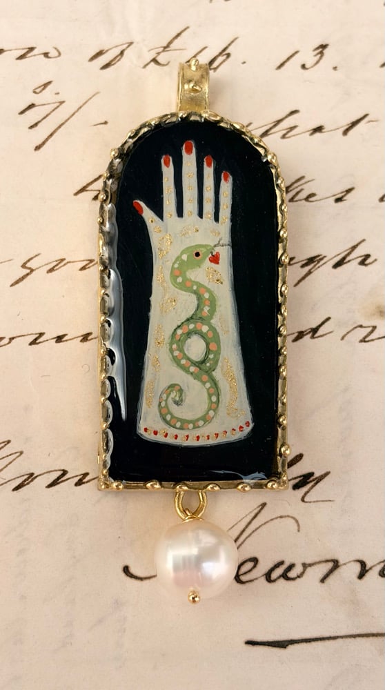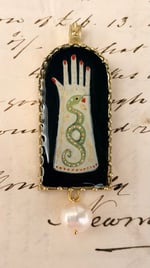 This pendant has a hand painted image set within a brass frame. The image depicts a white glove decorated with a snake. A small freshwater pearl hangs from the frame. It’s a unique one of a kind piece.