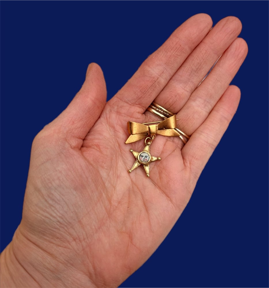 This tiny little star hangs from a vintage bow brooch. She’s completely handmade and a unique piece.