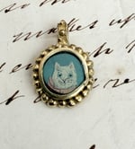 This sweet little cat has a slightly nervous expression! She has a pretty pink bow and is set within a duck egg blue background.